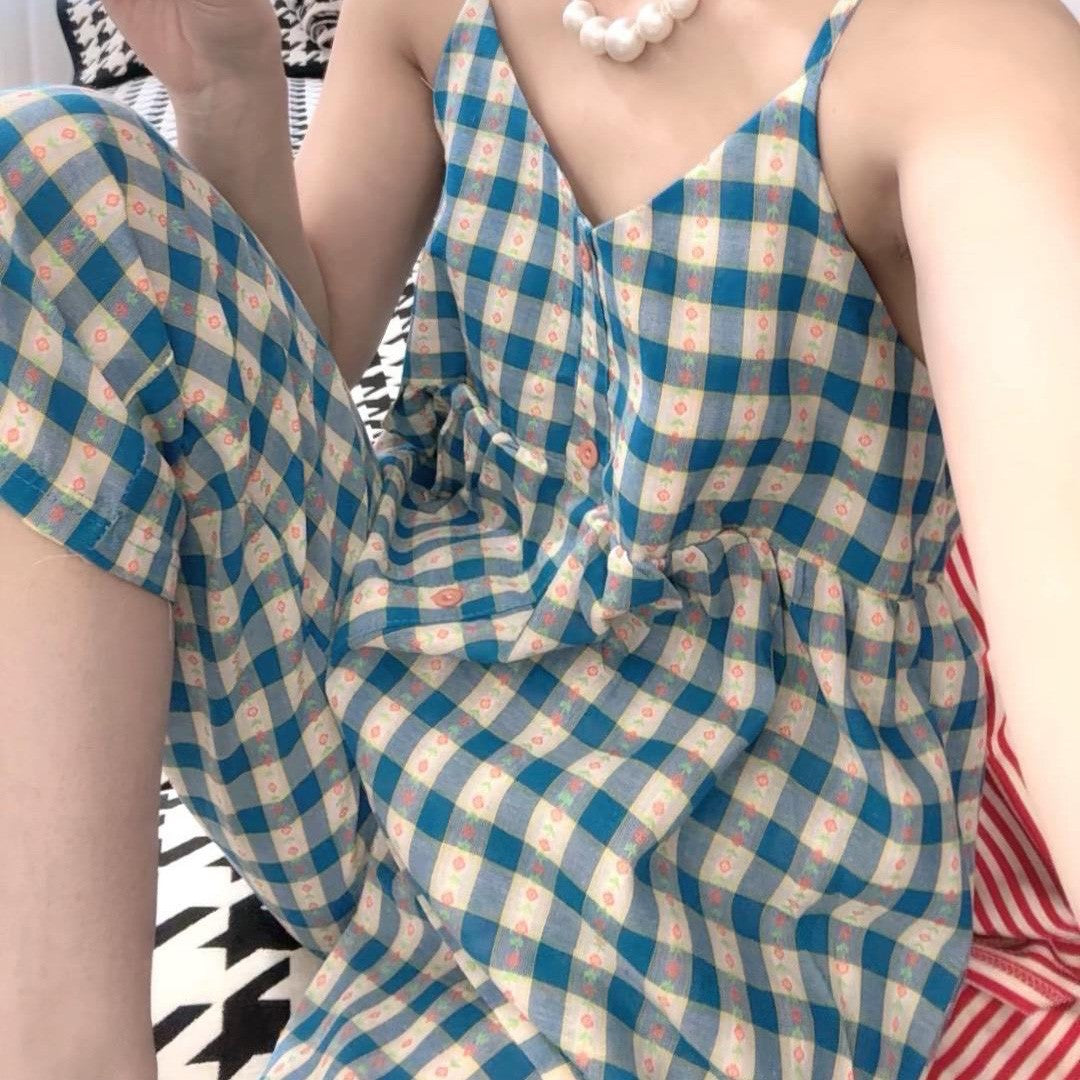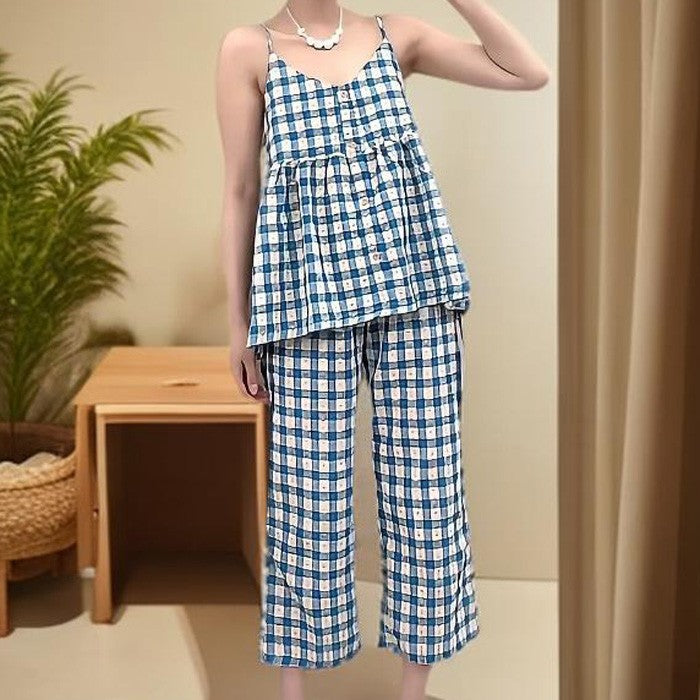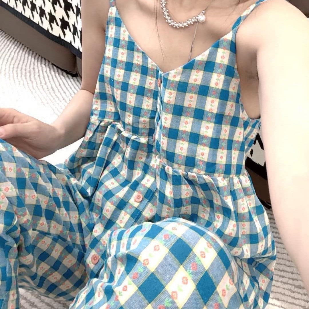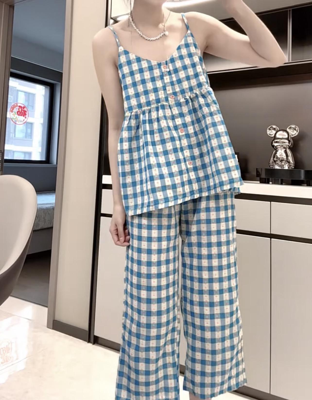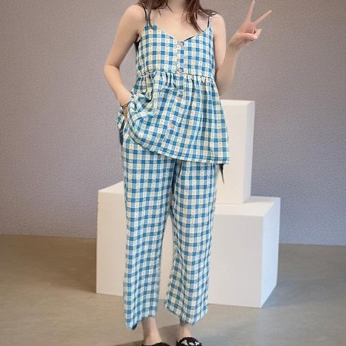 zp591-Suspender plaid loose and comfortable women's pajamas and pants set