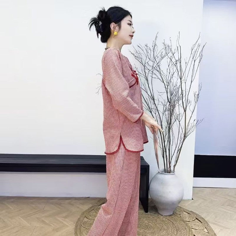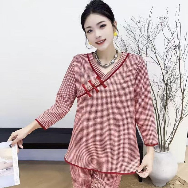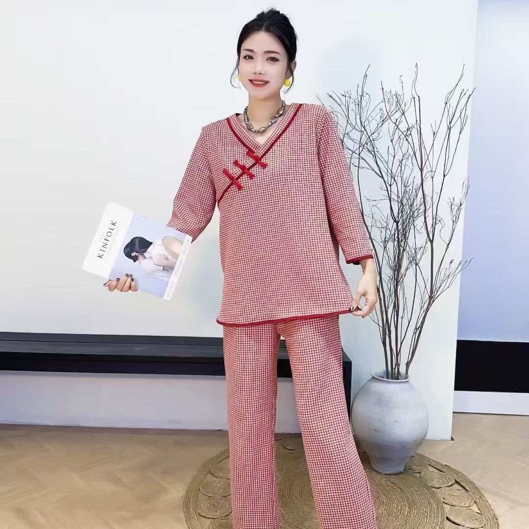 zp593-2025 New Oriental Style Plaid Print Pajamas Loose Set